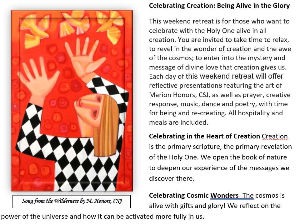 These workshops use PowerPoint presentations to weave the art of Marion Honors, CSJ, music, poetry, story, sharing and science into an experience of deeper awareness of our place in the web of life.